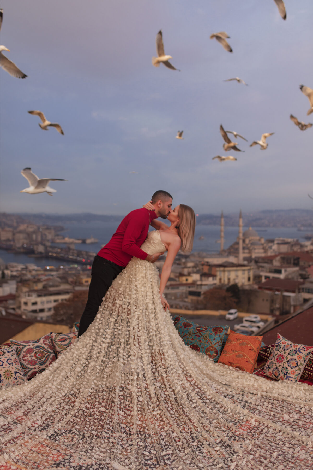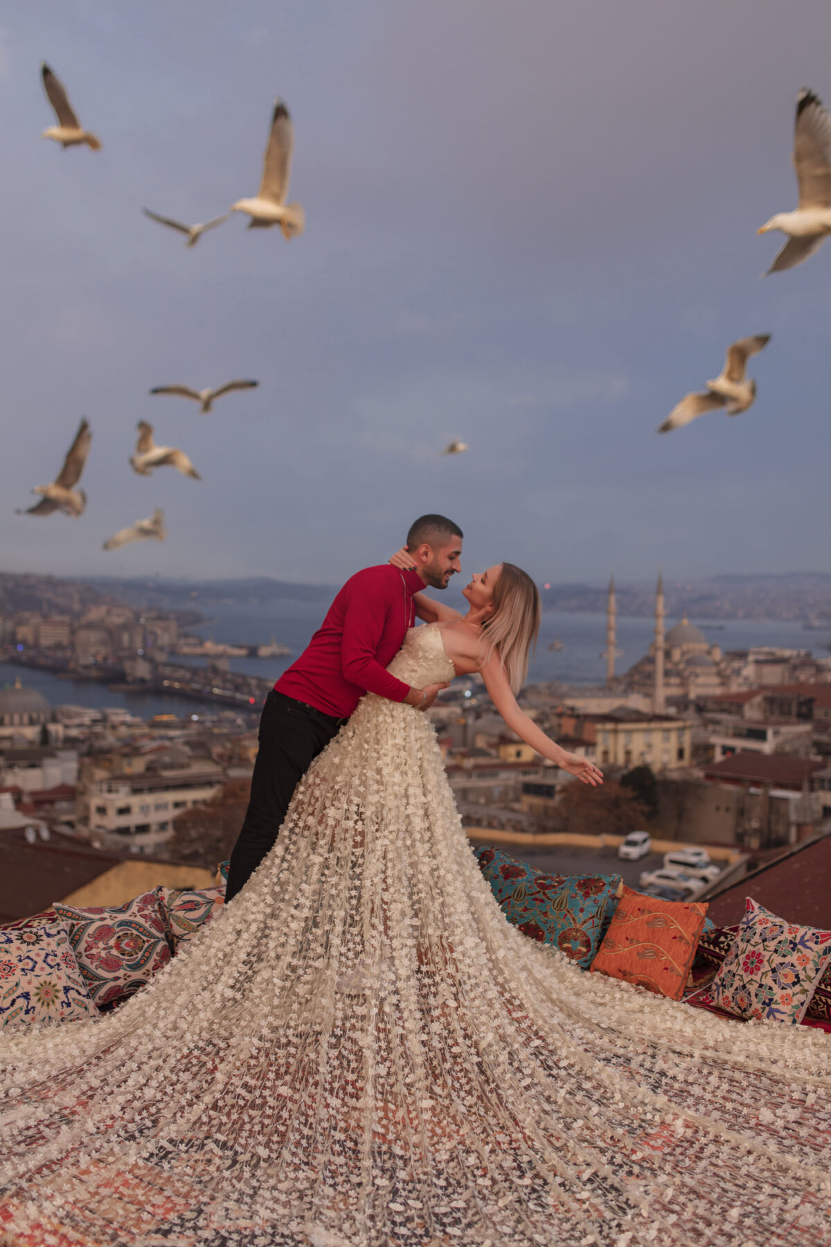 Dreamy Flying Dress Photo Shoot in Istanbul Experience a magical photo shoot on one of Istanbul’s most beautiful terraces, styled with traditional Turkish carpets!
