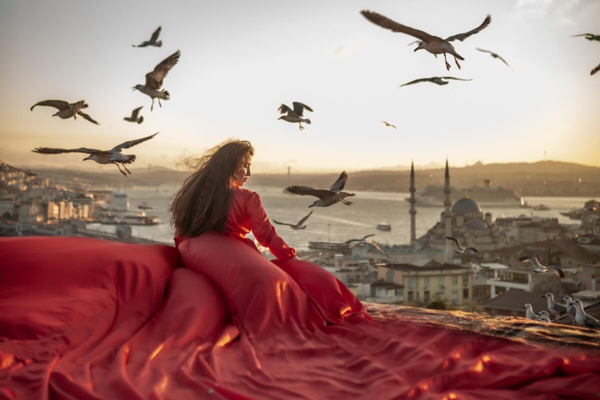 Now, imagine standing on an old rooftop in the heart of Fatih, with a cool breeze from the Bosphorus brushing against your face and the sound of birds filling the air. At that very moment, a flock of seagulls takes flight, and you—whether with a radiant smile or a bold, cinematic pose—become the centerpiece of a breathtaking scene. This is where historic and modern Istanbul come together in a single frame.